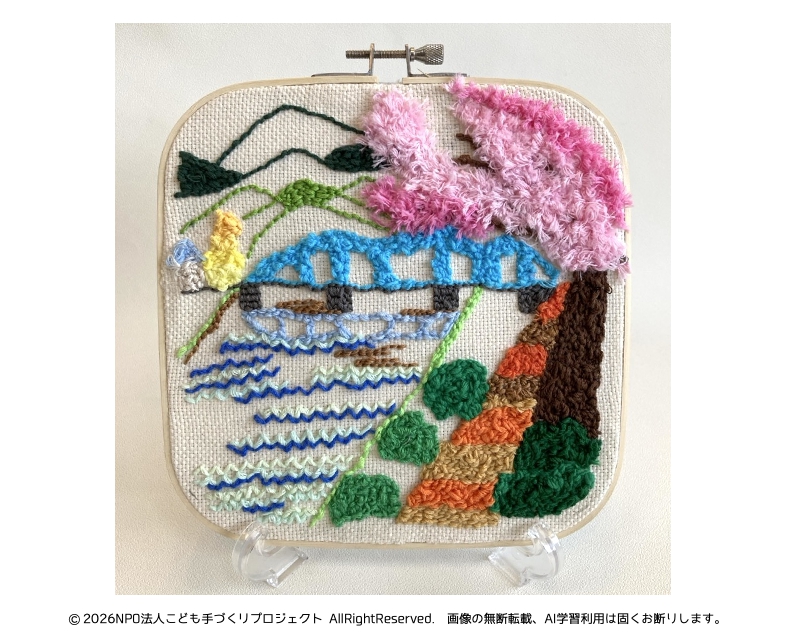 穴が空かないようにたくさん刺すのが大変でしたが、橋が川に映ったり、水の流れを表現するところが1番難しかったです。